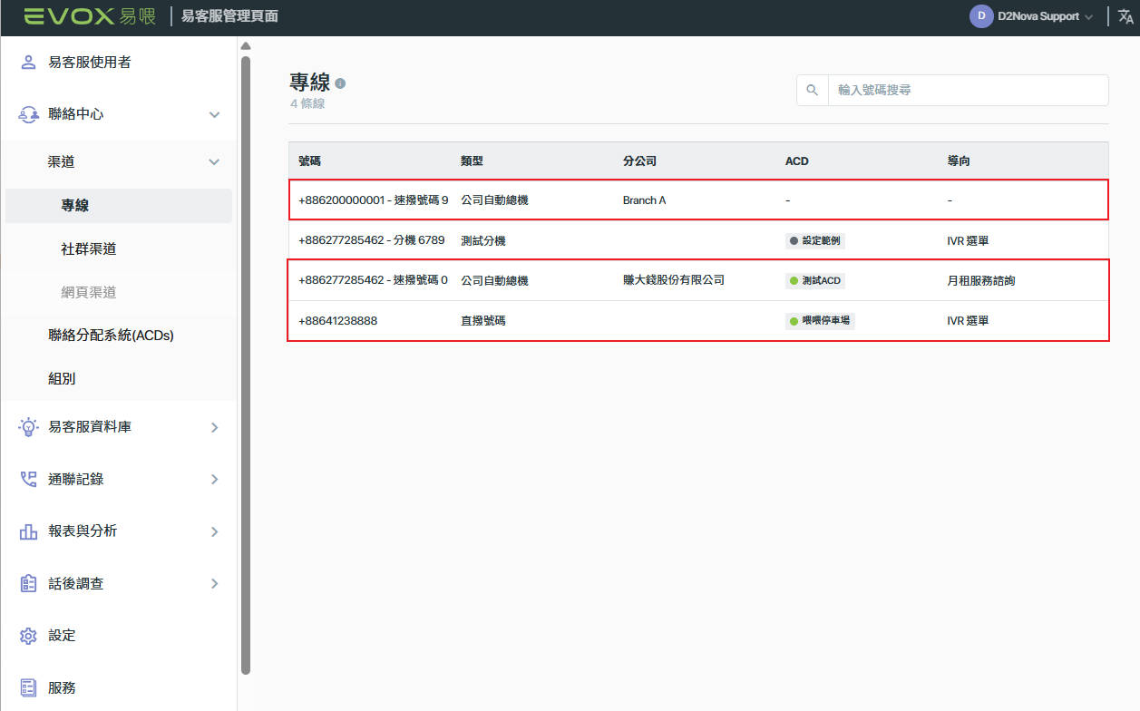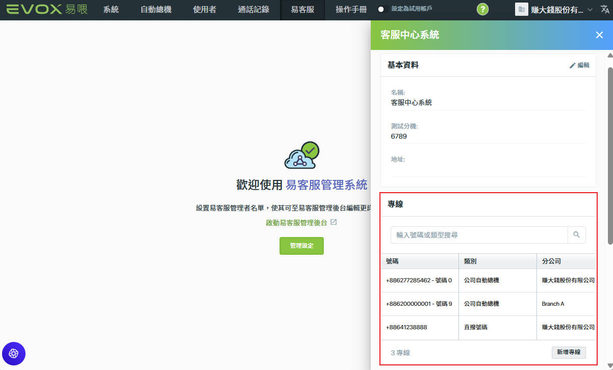 4. 客服管理者可於登入易客服後在【專線】的頁面確認到這三條可使用的專線