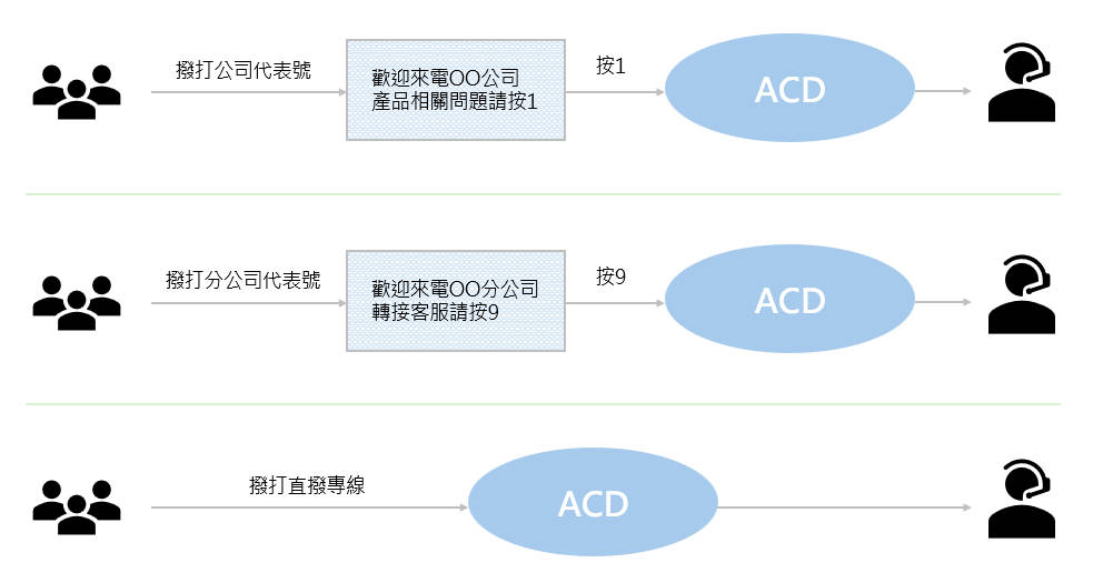 客服中心應用的方式有三種,前面兩種是來電者藉由公司代表號或分公司代表號進線,先聽到自動總機語音的引導後,按下轉入客服中心的速撥碼,即可導入客服中心的ACD來電分配系統進行派線;另一種則是來電者直接透過代表號以外的直撥專線進線,此直撥專線直接設定給ACD來電分配系統,搭配來電分配系統內的語音選單再做系統派線。