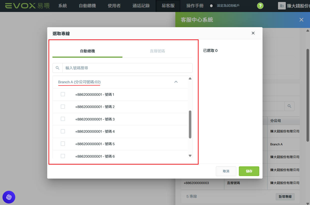 2. 指派一條可使用的專線(公司代表號+速撥碼、分公司代表號+速撥碼或是 直撥專線) 給客服中心系統做設定