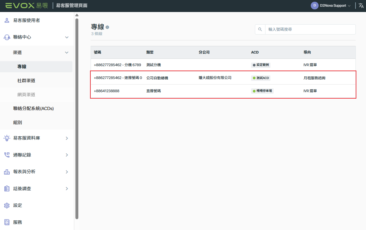 4. 客服管理者可於登入易客服後在【專線】的頁面確認到這兩條可使用的專線