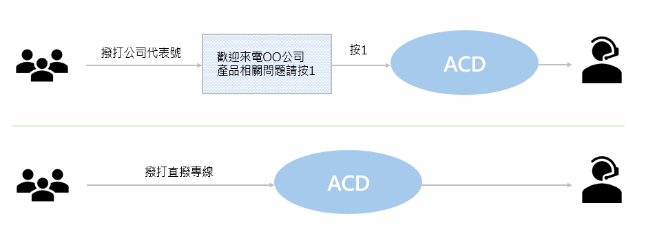 客服中心應用的方式有兩種,第一種是來電者藉由公司代表號,先聽到自動總機語音的引導後,按下轉入客服中心的速撥碼,即可導入客服中心的ACD來電分配系統進行派線;另一種則是來電者直接透過代表號以外的直撥專線進線,此直撥專線直接設定給ACD來電分配系統,搭配來電分配系統內的語音選單再做系統派線。