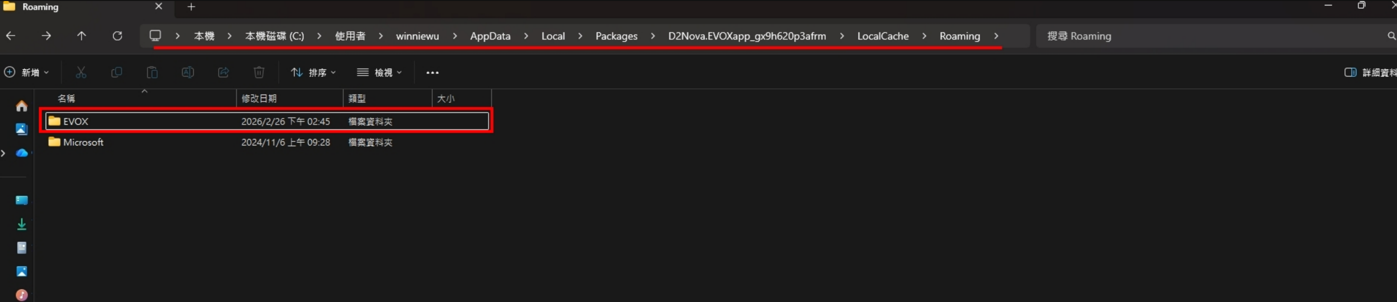 路徑👉 C:\Users\使用者名稱\AppData\Local\Packages\D2Nova.EVOXapp_gx9h620p3afrm\LocalCache\Roaming\EVOX