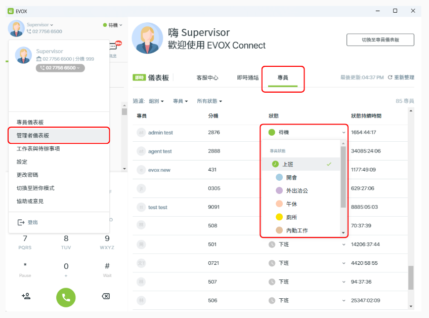 過去僅限專員本人可以切換狀態,現在管理者可透過 電腦版 PC App 的 管理者儀表板(Supervisor Dashboard),協助調整專員狀態。
