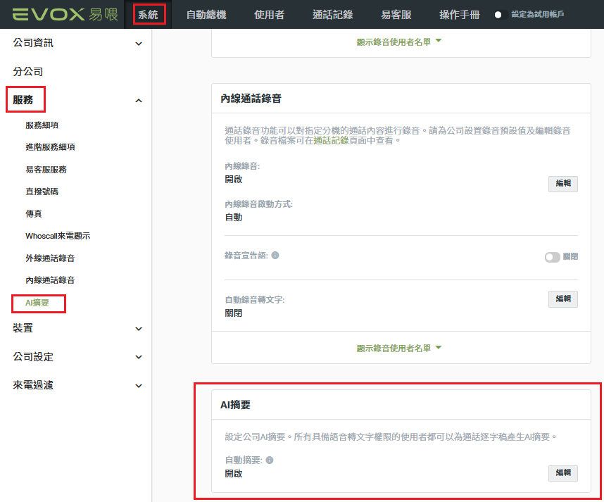 若要調整公司設定,您可以到「系統 」> 「服務」> 「外線通話錄音」找到「錄音轉文字」開關。每當您調整設定,具有「公司設定」標籤的人員也會跟著連動。