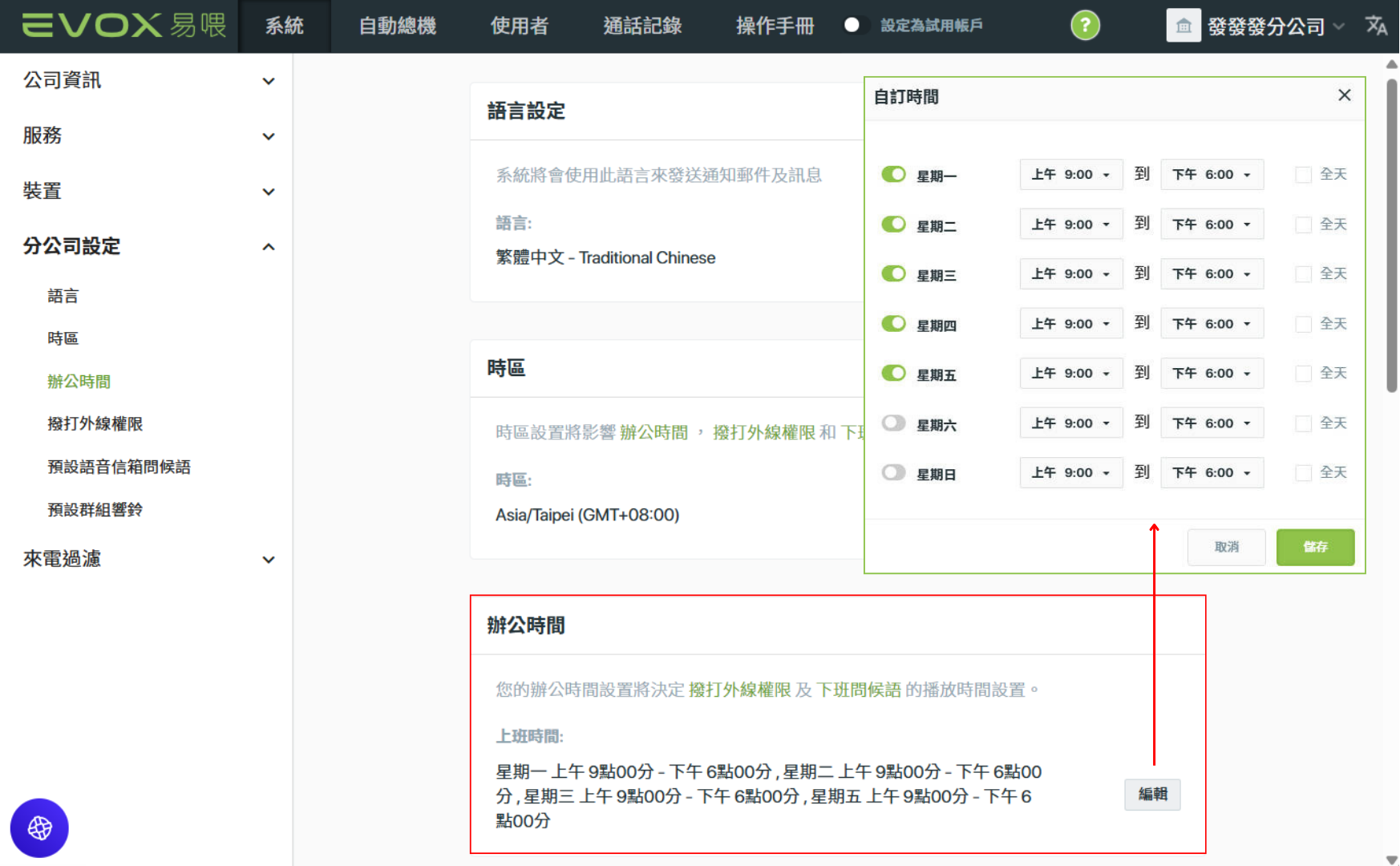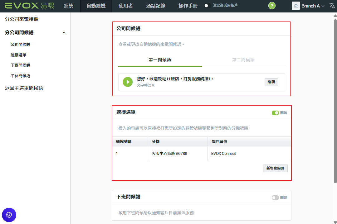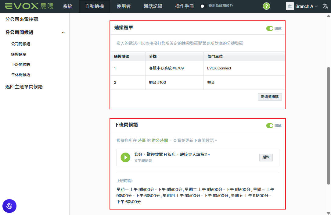 利用分公司「辦公時間」,依訂房中心上下班時間設定,系統會自動播放對應問候語給分館來電者。