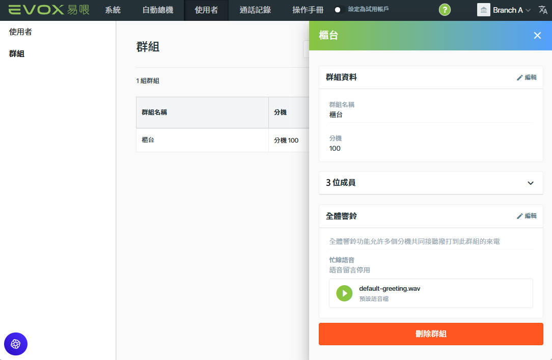 分館來電者透過分公司代表號 + 速撥碼 2 ,轉接至「櫃台群組 」全體響鈴