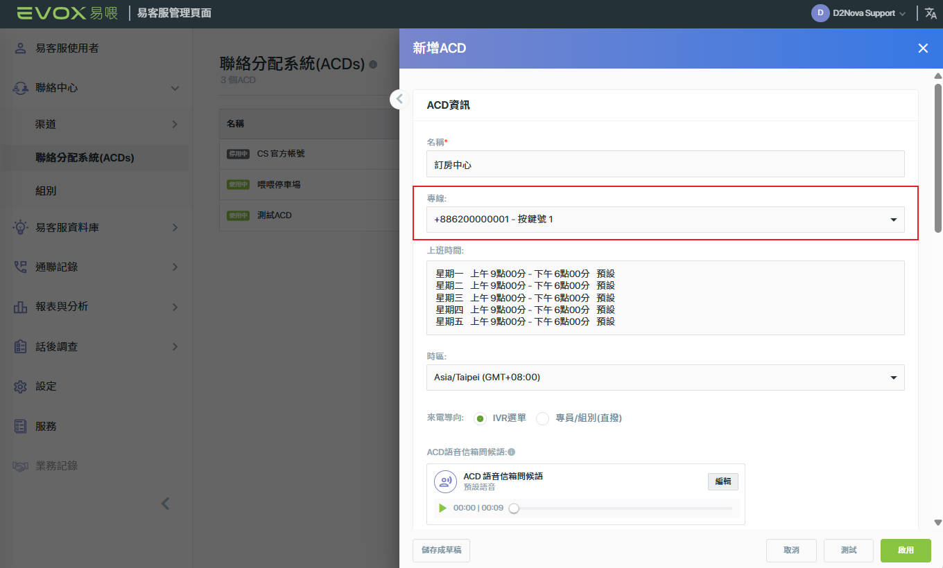 總公司設有「訂房中心」,負責所有分館的電話訂房與相關查詢,並有固定上班時間(09:00–18:00)。各分館在面對來電時,除了需協助現場住客,也會接到大量的訂房詢問,因此希望能快速將訂房相關的來電轉接至總公司的訂房中心 ACD,由專人統一服務。