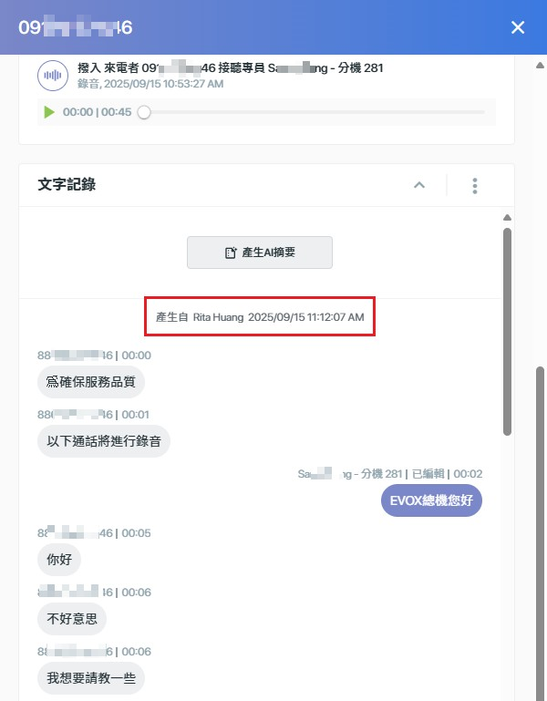 您可以開啟會關閉這個開關,開啟後同仁未來所有通話錄音會自動轉成文字,關閉後就不會再自動轉文字而需要從通話記錄點擊「錄音轉文字」。