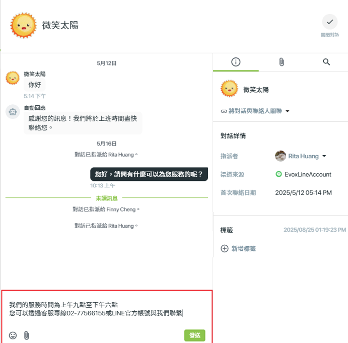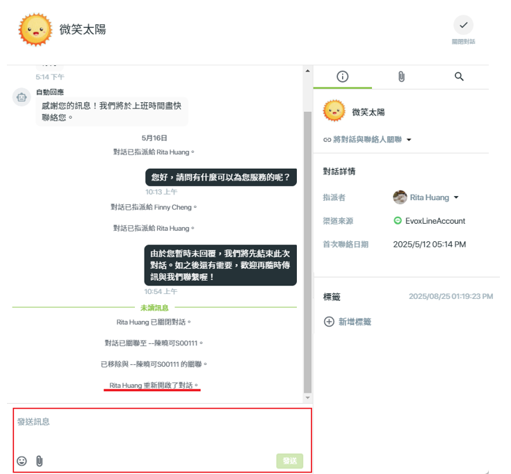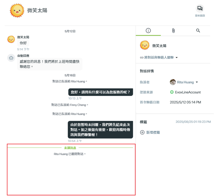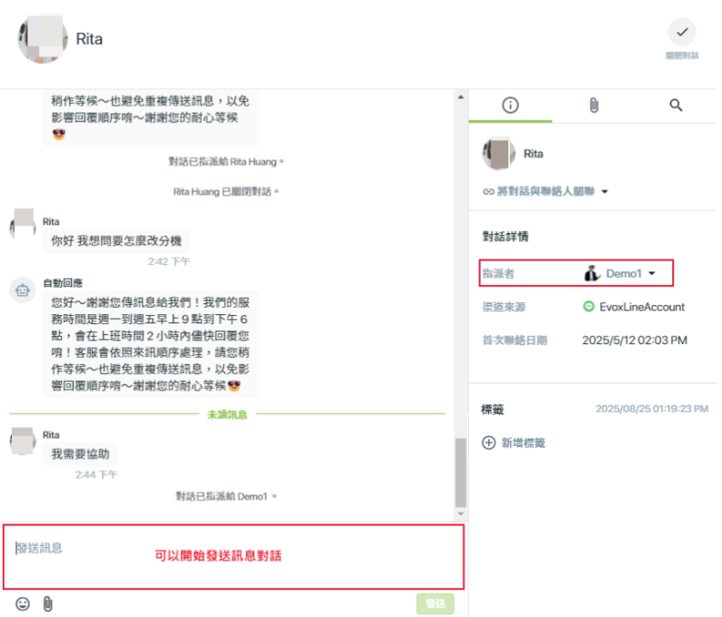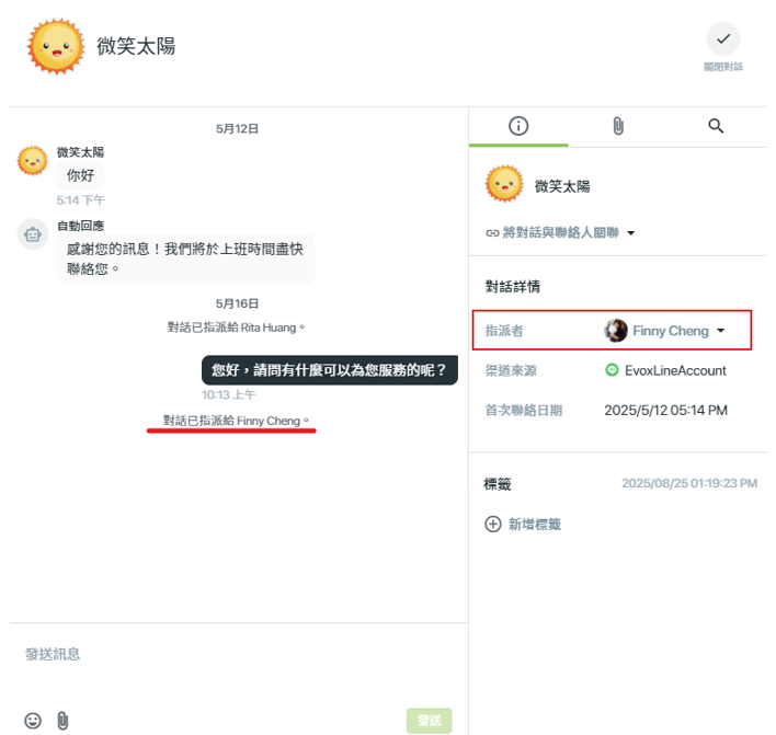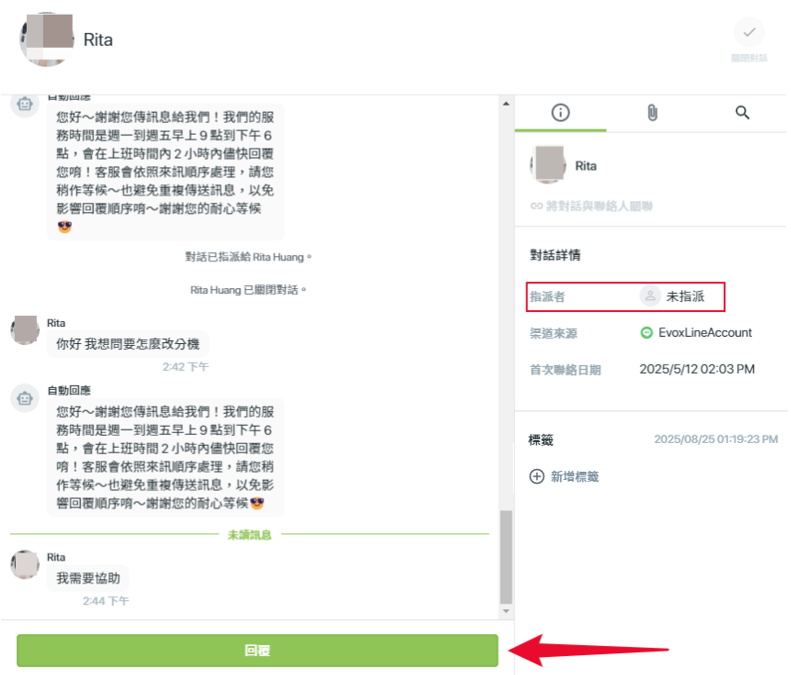 當專員首次回覆訊息時,該對話的狀態會自動從【未指派】變更為【指派】
