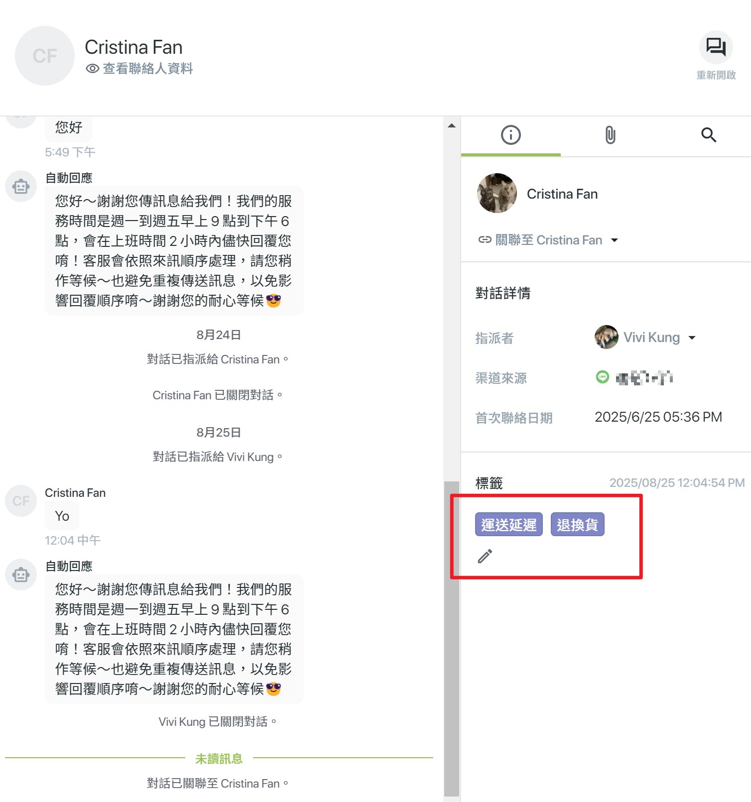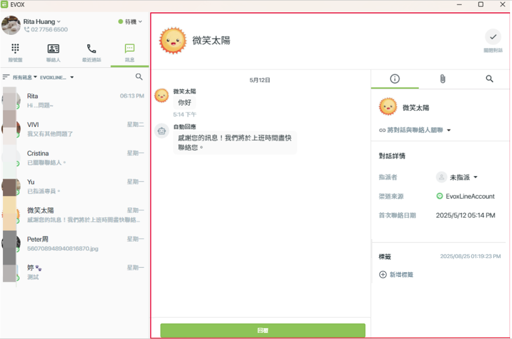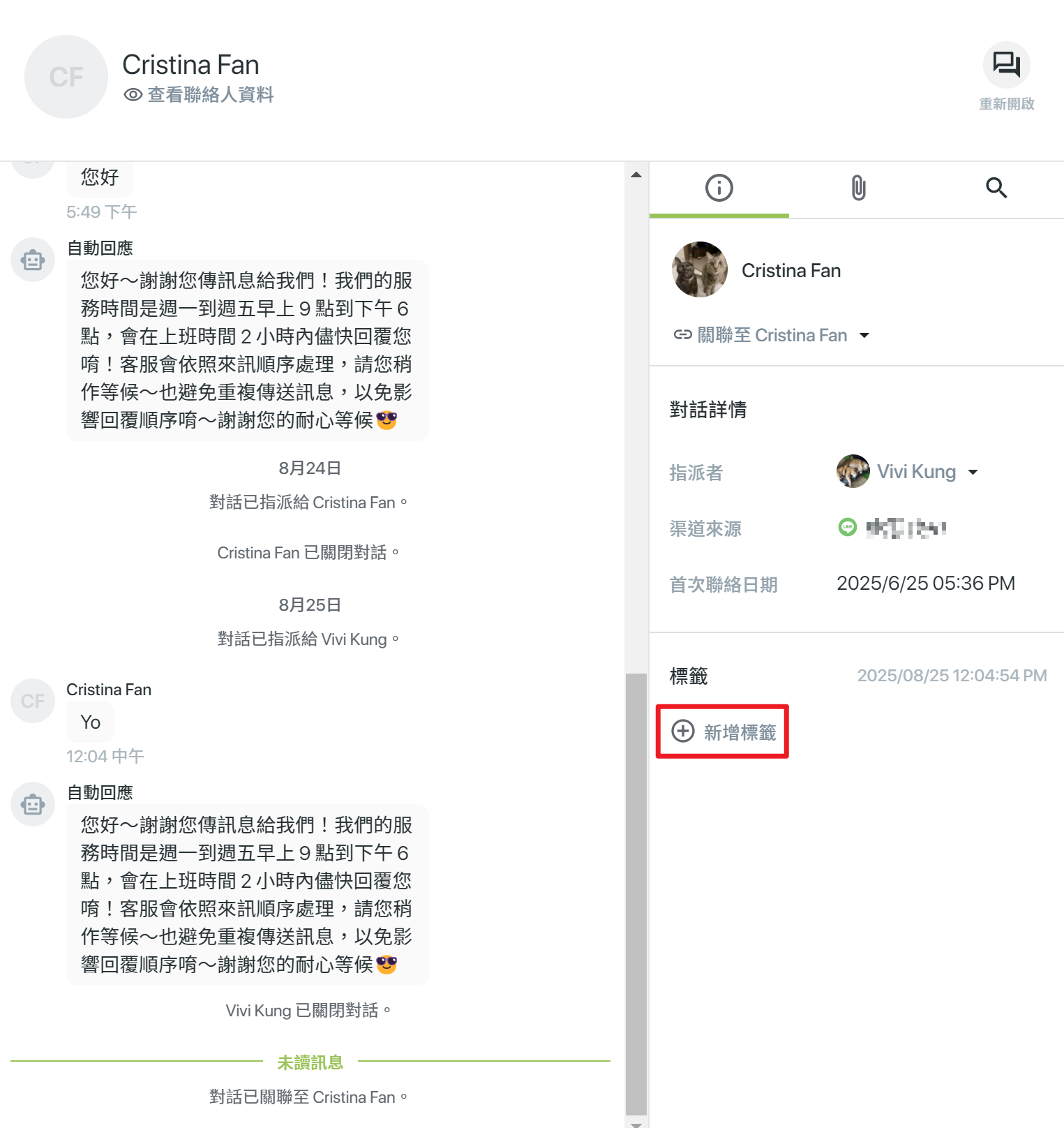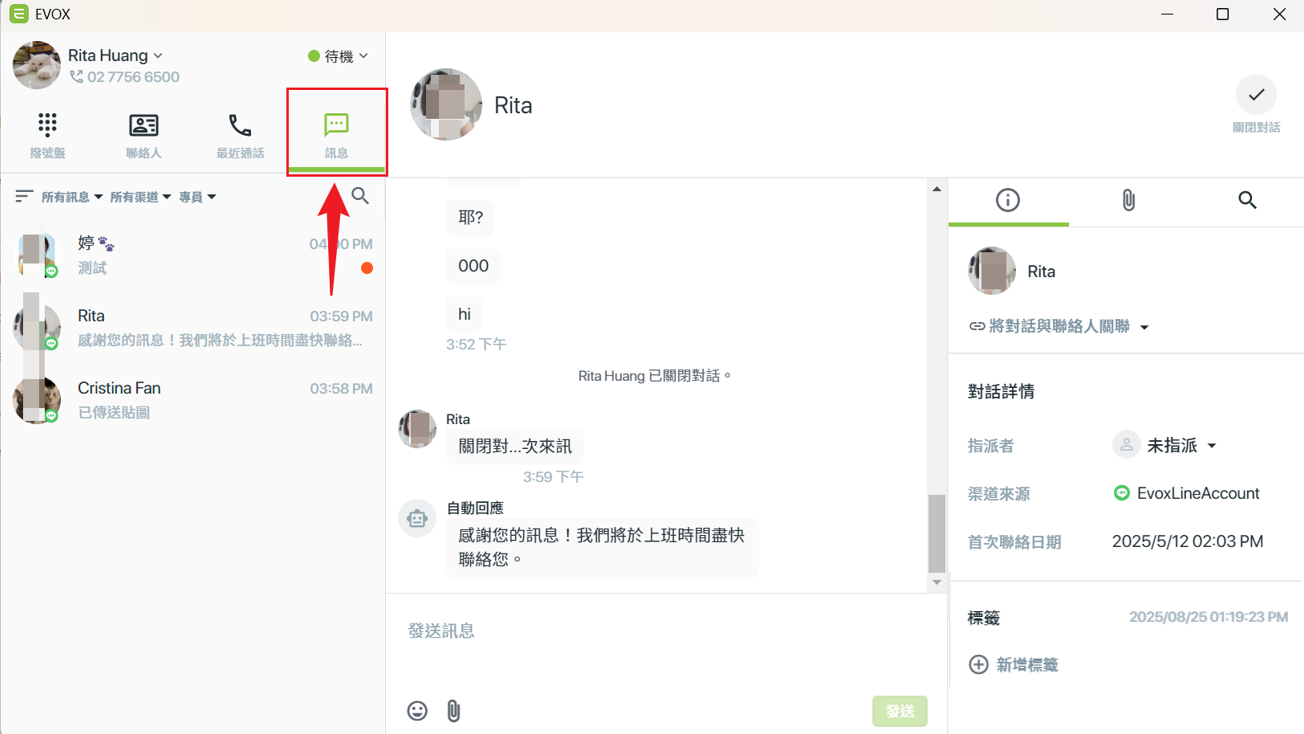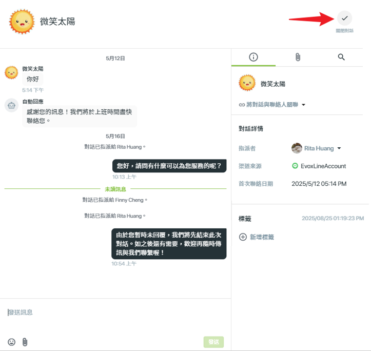 - 貼標籤:可為對話加上標籤,方便分類與後續管理
