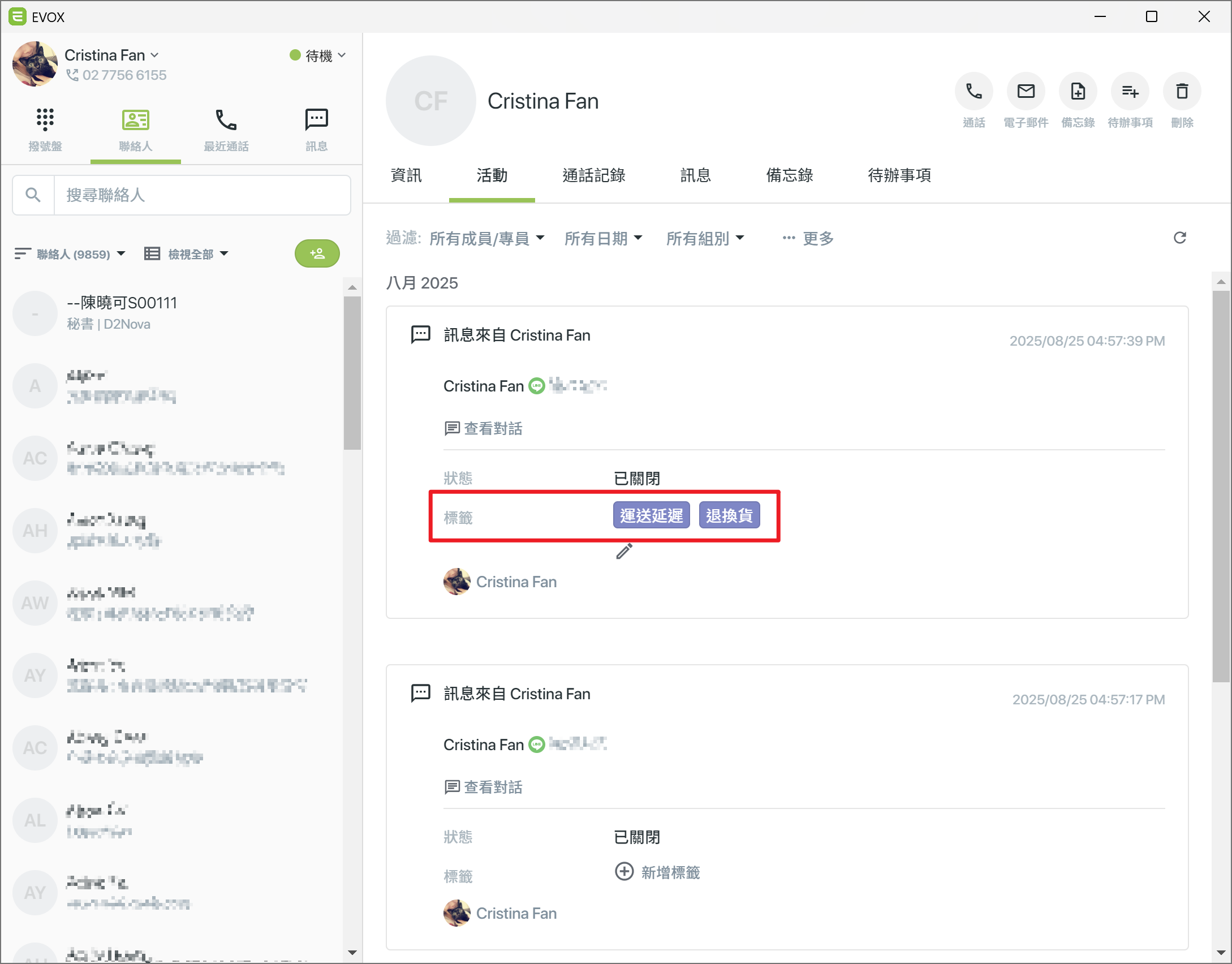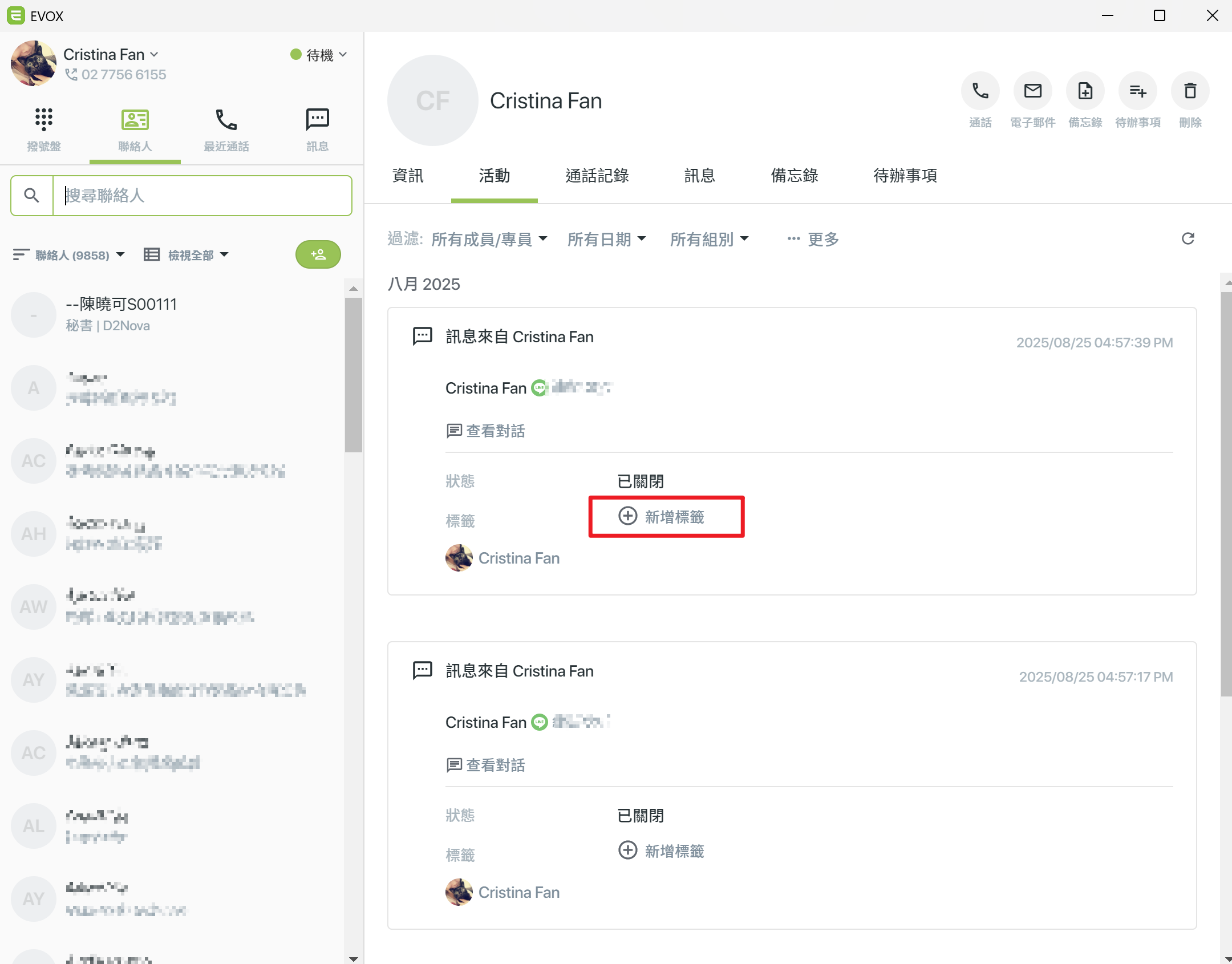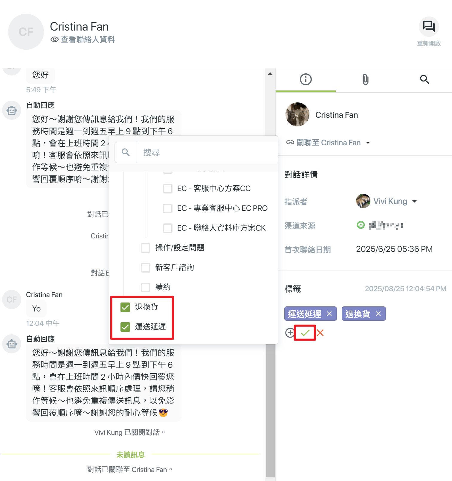 - 貼標籤:可為對話加上標籤,方便分類與後續管理