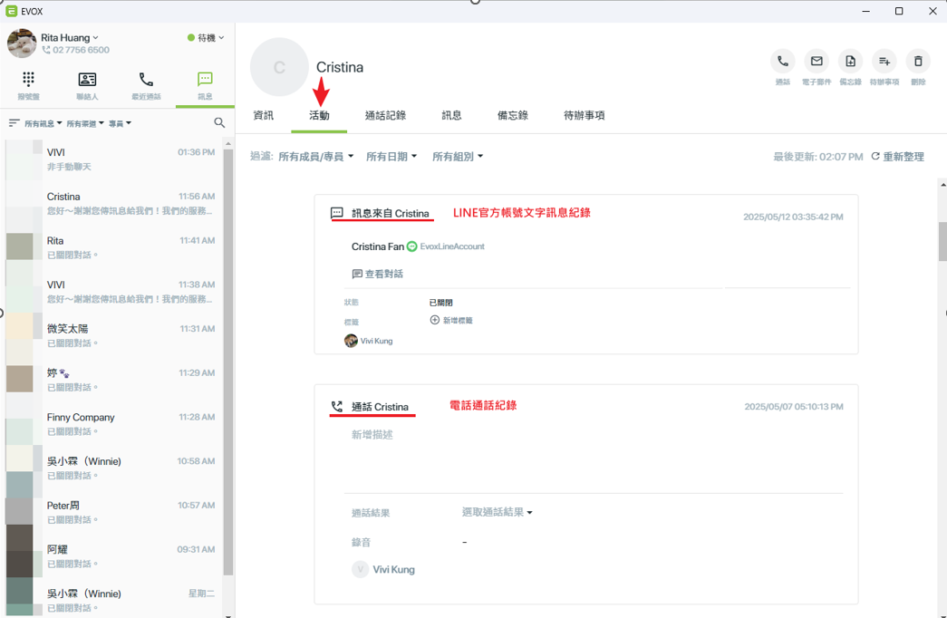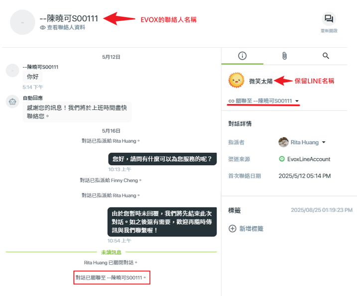 點選【將對話與聯絡人關聯】 →關聯現有的聯絡人 | 關聯完成 →對話名稱將改為EVOX聯絡人名稱 |