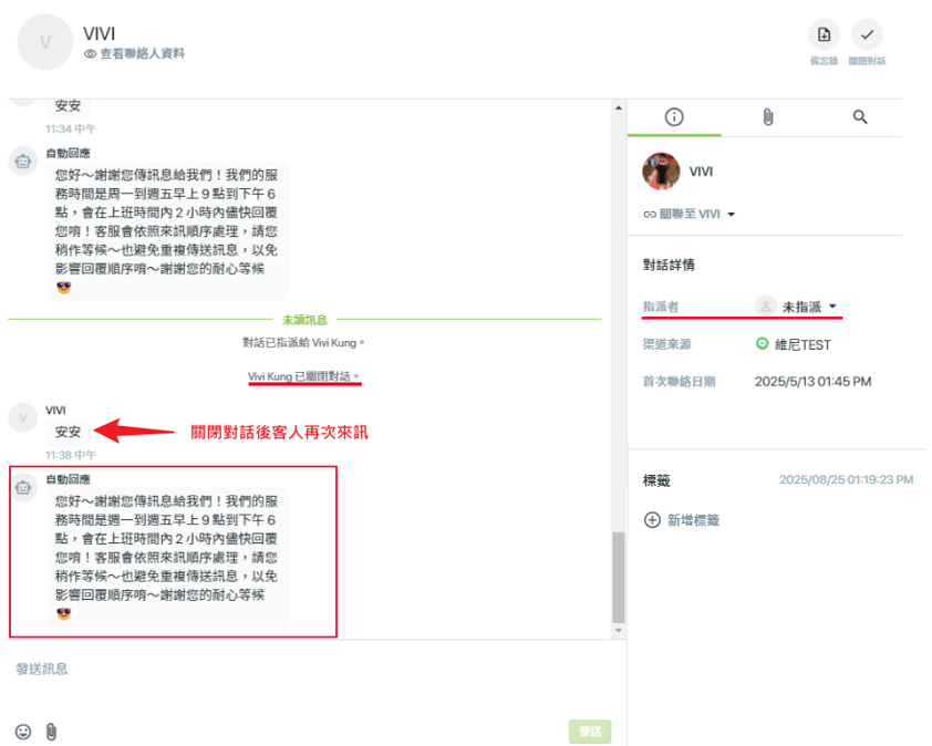 - 客戶再次傳訊時,系統會自動產生新的「未指派」訊息,並且再次發送自動回應訊息