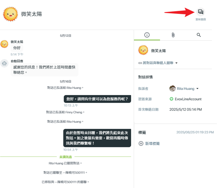 - 專員可透過右上角「重新開啟」功能,延續之前的對話內容
