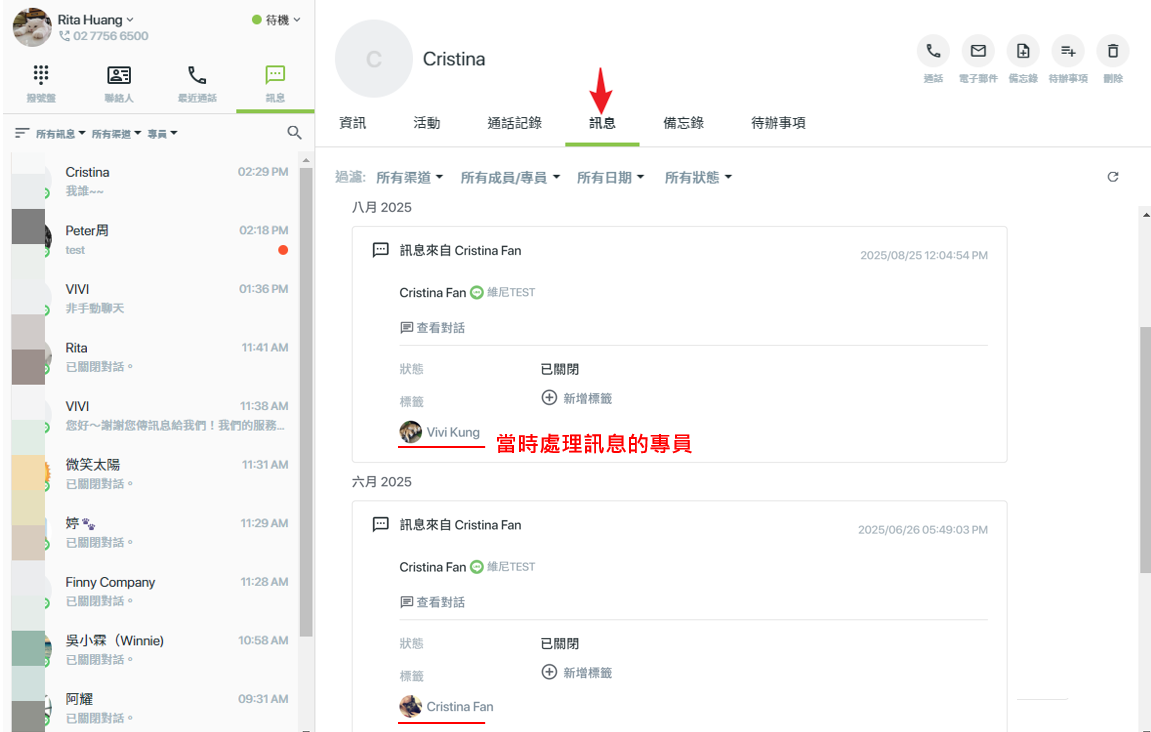 當有新訊息進來 該訊息會顯示在列表最上方 並標示紅點作為未讀提醒 專員可點選該訊息以展開查看內容 |